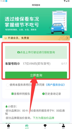 在维保查询页面,您可以通过上传行驶证或者手动填写车架号,然后点击“立即查询”按钮,即可获取相关的维保记录。