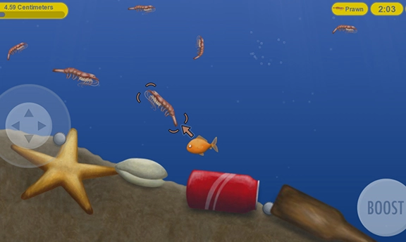 游戏里的操控运用虚拟摇杆的操作方式,左侧用于控制小鱼的移动,右侧是耐力加速功能,点击就能触发加速效果。