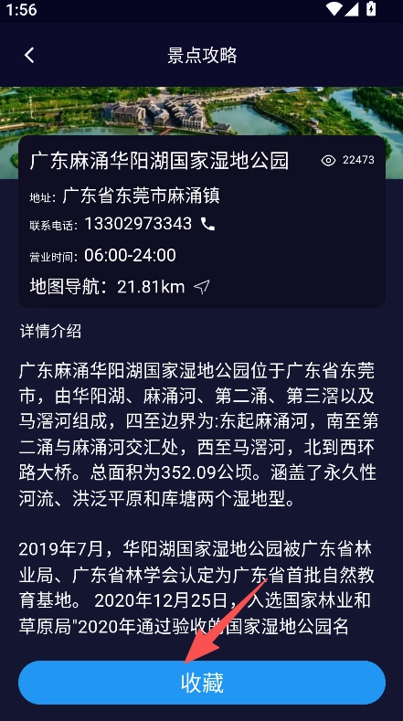 点击景点攻略板块,挑选出你喜爱的景点,进入该景点的详情页面后,就能查看其地址、营业时间等信息,还可以进行收藏操作。