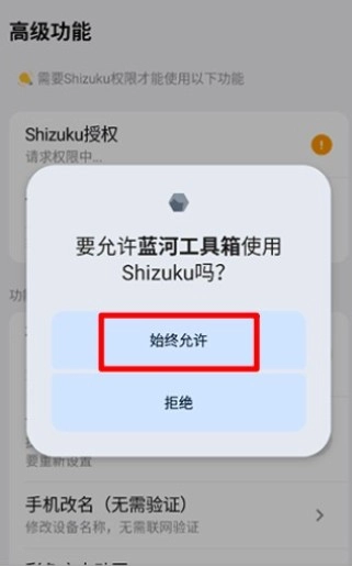 请先下载并安装Shizuku应用,按照指引完成激活流程,随后在蓝河工具箱中完成权限授权。