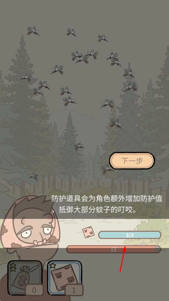 在森林场景里,要是遇到蚊子骚扰,能通过操作把蚊子赶走,借助防护道具提升防护值,以此抵挡大多数蚊子的叮咬。
