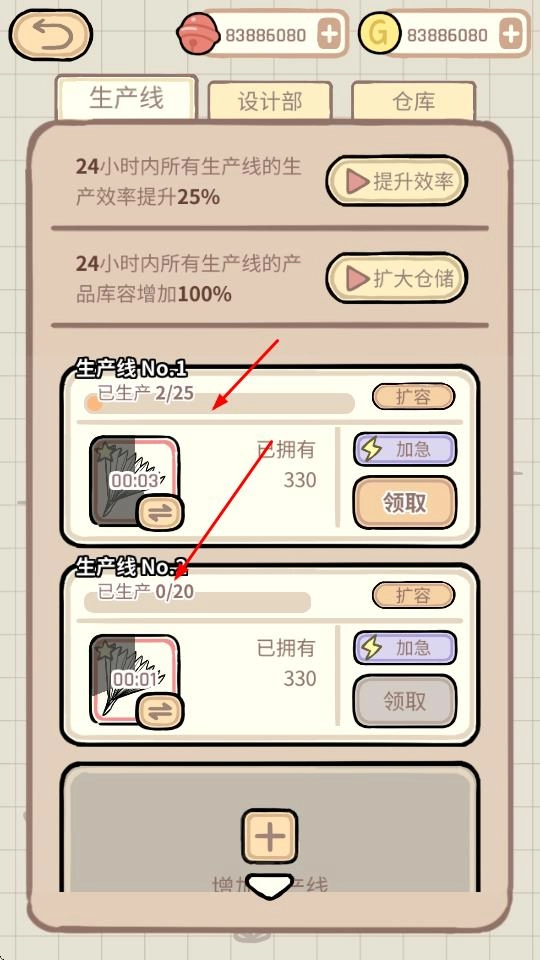 进入生产线界面,可实现提升生产线效率、扩大仓储规模、管理多条生产线以及领取或加急生产物品等功能。