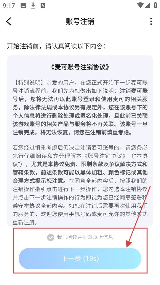 在账号注销页面阅读并同意相关协议后,点击【下一步】按钮,即可继续进行注销操作,是不是很简单呢?