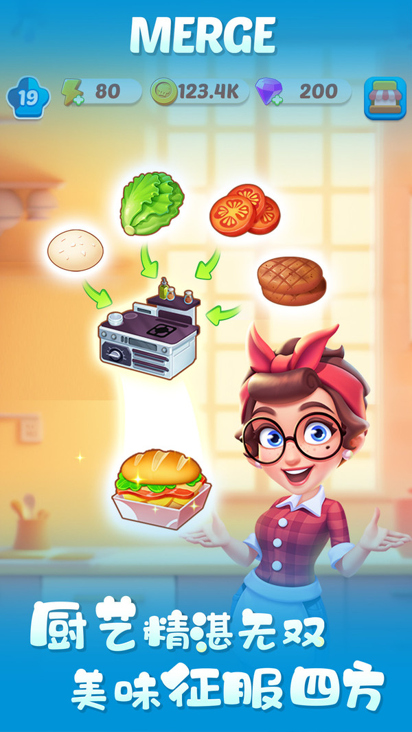 合合大厨是一款融合合并玩法与模拟经营的休闲美食手游。游戏以环球美食旅行为主题,玩家将化身主厨,跟随助手莉娅跨越 30 座全球知名城市,解锁超 300 道世界名菜。通过合并食材获取烹饪原料,经营从街头小摊到米其林餐厅的店铺,还能 DIY 餐厅装饰、升级厨具,满足不同顾客需求,在烹饪中感受各地美食文化,兼具操作乐趣与经营成就感。