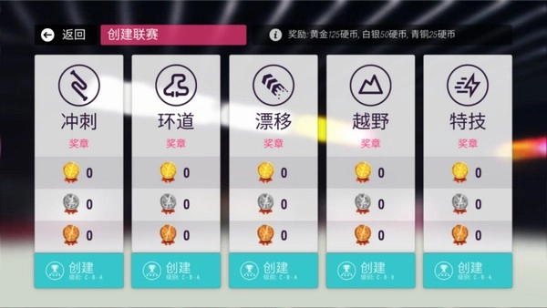 5、点击创建个人联赛,可选择冲刺、环岛、漂移、越野、特技等多种模式
