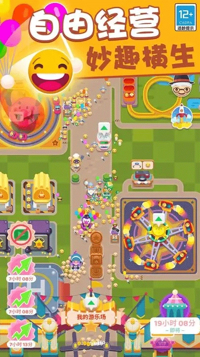 把游乐设施安置妥当后,就会有游客前来游玩,图中的小表情代表的就是游客,点击设施上的“绿色箭头”就能继续进行升级操作。