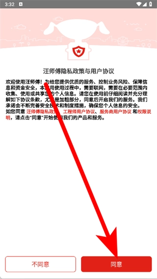 打开汪师傅后,当弹出隐私政策与用户协议的窗口时,点击同意按钮。