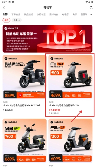 在车型详情页面,点击Ninebot九号电动自行车Fz110的车型条目,即可进入该车型的详情页面。