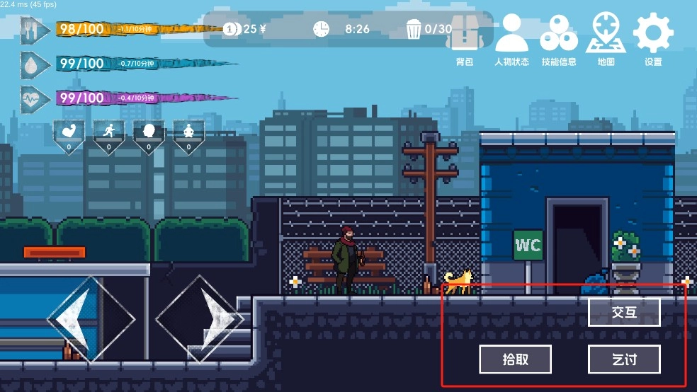 《流浪者2》是一款像素风格的模拟生存游戏,玩家将化身为一名流浪汉,在危机四伏的城市中挣扎求生。游戏中,你需要操控角色完成各类生存任务,时刻关注自身的状态指数——游戏完善的生存系统会清晰展示饥饿、健康、精力等多项数值,帮助你及时调整策略以维持生存。此外,城市里还提供了多种工作机会供你尝试,每项工作都需要消耗一定时间,但完成后能提升对应的属性值。只有不断强化自身能力,才能在这座残酷的城市中长久立足。