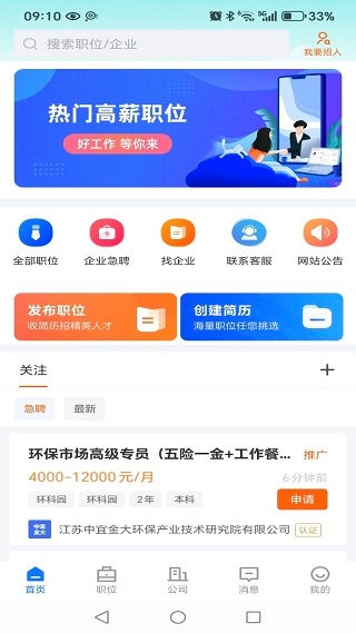 首页设有全部职位、企业急聘、找企业等功能入口,方便我们同时浏览各类优质工作机会。