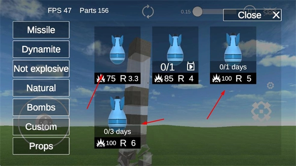 打开道具选择界面,挑选合适的爆破类道具,借助其破坏效果来提高建筑损毁的效率,从而积累更多积分。