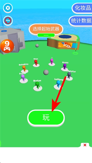 点击界面上的绿色“玩”按钮就能进入游戏,并且可以挑选初始武器来开启对局。