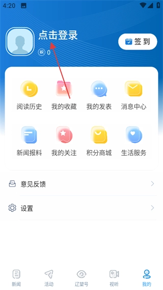进入软件新闻页面,点击底部我的,进入个人页面。
