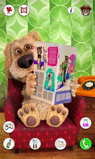 点击狗狗本右侧的电话,电话就会响起来,狗狗本会拿起电话倾听,这时你可以和它对话,狗狗本会认真听你说话,还会重复你说的内容,你说的任何话它都能听到。