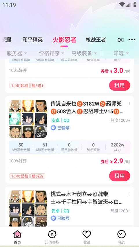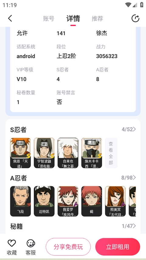 往下滑动选择一款品相、价格合适的账号点击租用;