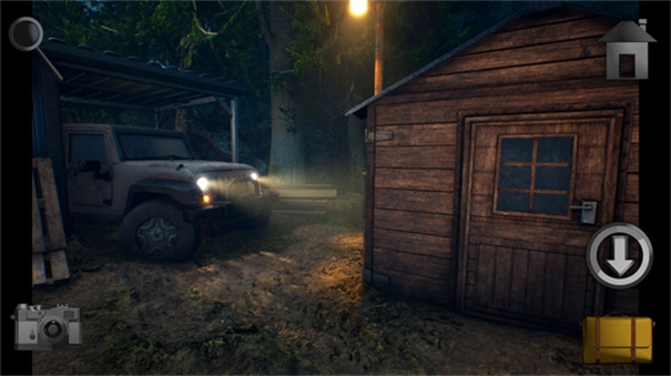2、出门后注意到保险丝盒损坏,且位置过高无法触及。返回左侧路径走向海滩,登上船找到车钥匙,开启车灯照亮前方的小屋。