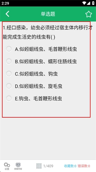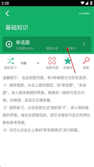 在基础知识题型选择页面,点击单选题选项即可进入单选题答题界面。