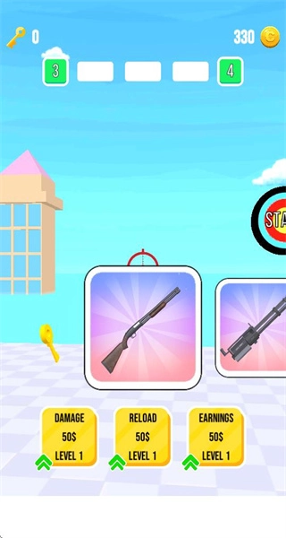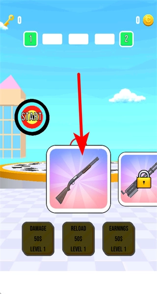 进入游戏后,选择初始枪械(比如猎枪),确定武器后进入射击关卡,开始打靶挑战的流程。
