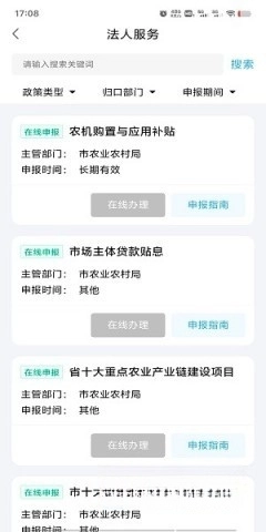 “政府服务”设有“个人”“法人”“专项服务”三大模块,总计76个服务项目。其中,个人类服务包含产业补贴、农业支持、教育、医疗、社保等内容;法人类服务涵盖产业政策、农业贷款等方面;专项服务类则涉及农村金融、农业服务等领域。