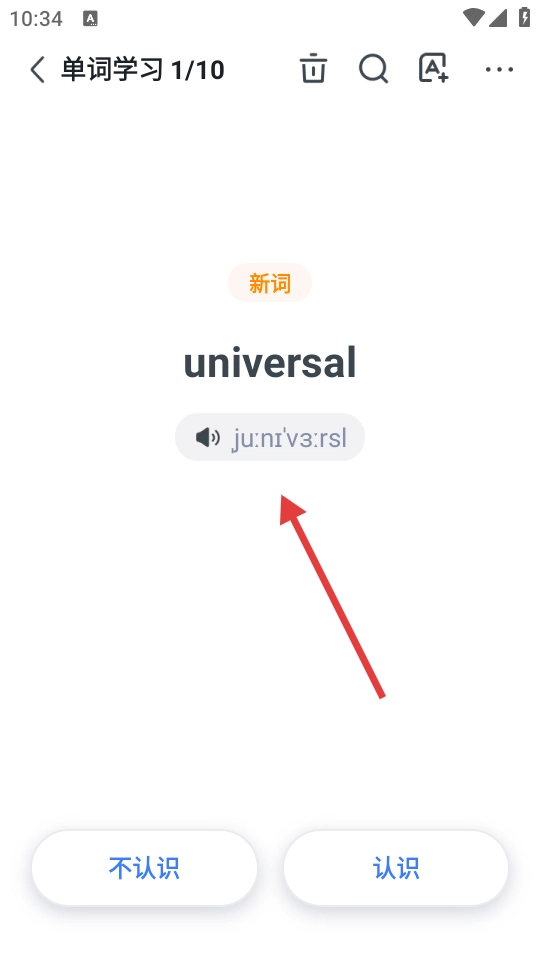 在单词学习界面,你可以学习像【universal】这样的单词,还能查看它的发音,并且自主选择是否认识这个单词。