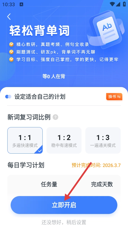 在计划设置页面,调整好词条复习与新词学习的比例,以及每日的学习任务量后,点击【立即开启】按钮,就能进入单词学习的界面了。