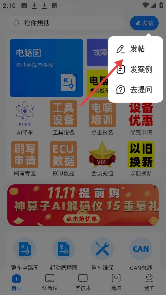 点击【发帖】按钮后,可在弹出的选项中选择【发帖】【发案例】或【去提问】进行相应操作。