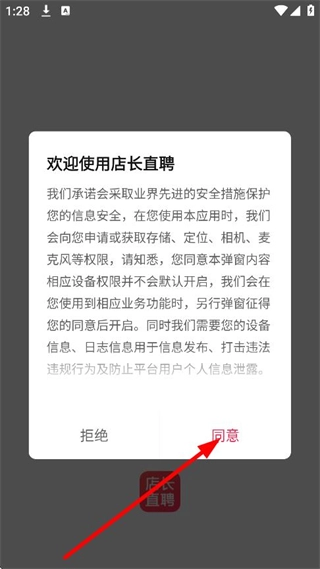 当弹出“欢迎使用店长直聘”的提示窗口时,点击“同意”按钮,即可进入登录或注册页面。