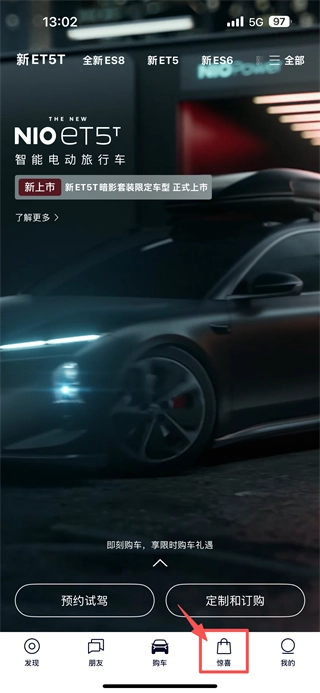 打开蔚来应用后,点击底部导航栏中的“惊喜”选项,即可进入NIO-Life板块页面。