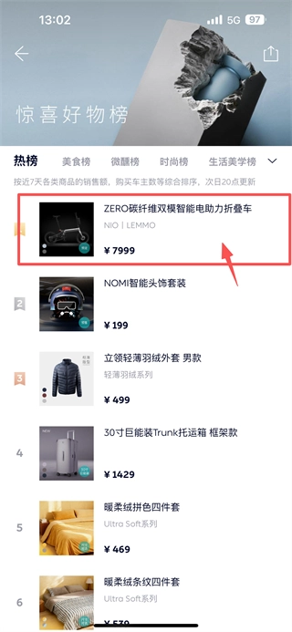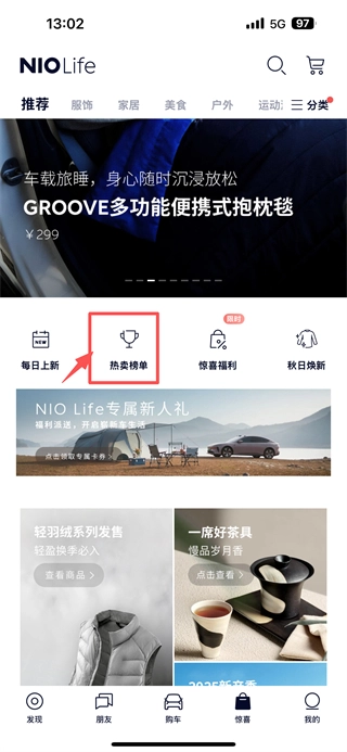 在NIO-Life页面,找到并点击热卖榜单选项,即可查看热卖商品的列表。