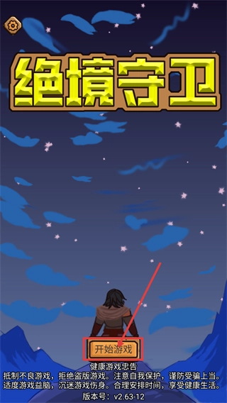 进入《绝境守卫》游戏时,先点击“开始游戏”按钮进入玩法,同时留意健康游戏忠告,合理安排游戏时长。