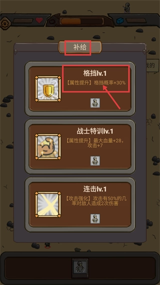 在【补给】界面优先升级【格挡lv.1】,该技能的【属性提升】能带来30%格挡概率的加成,有助于强化角色的生存能力。