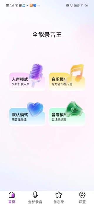 首页设有多种功能模式可供选择,包括人声模式、音乐模式、默认模式以及音响模式。