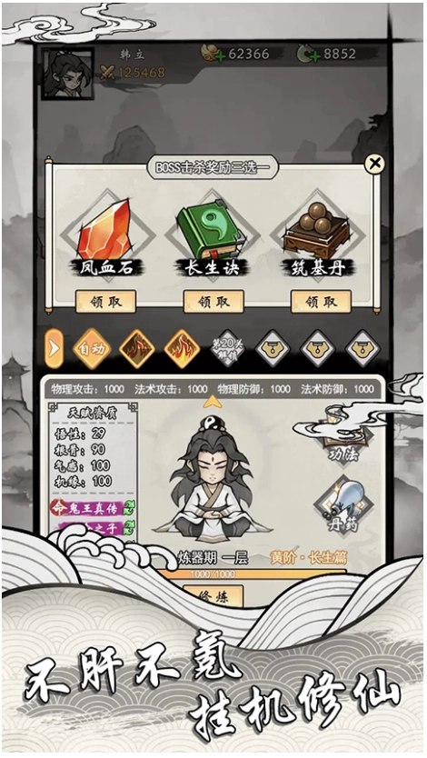 挂机修仙,挑战副本,获取海量资源,游戏奖励拿到手软。