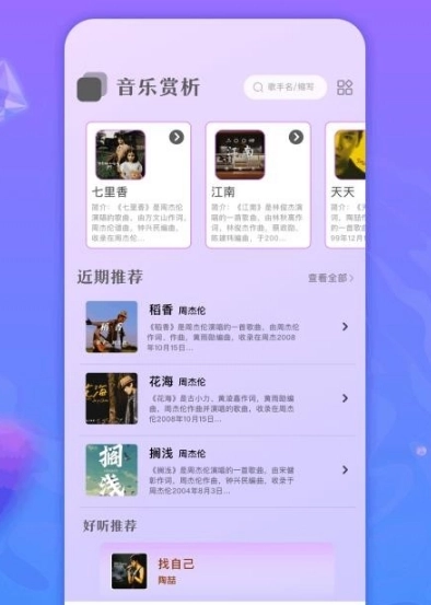 智能为用户推荐悦耳的歌曲,支持自由在线搜索与播放,全方位满足用户日常听歌的需求。