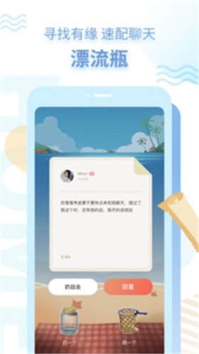 探遇漂流瓶是一款功能强大且实用的漂流瓶社交软件,汇聚了海量单身资源,用户能随时在线与心仪之人互动。平台提供丰富的交友玩法,可随时开启聊天互动,助你结识更多新朋友,有效扩大交友圈。