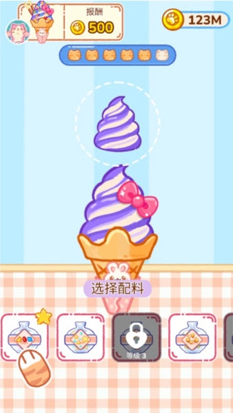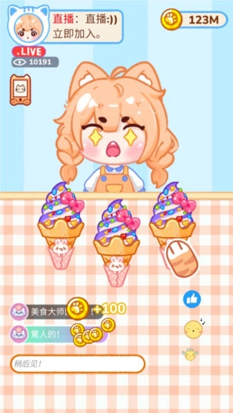 在游戏里成为吃播博主,亲手制作各式各样的美味冰淇淋,同时还有多种限定食材可由玩家解锁购买,用来打造不同特色的冰淇淋作品。