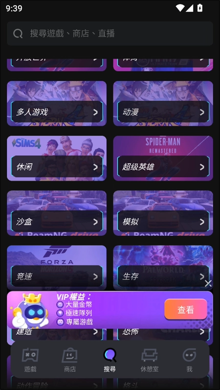在搜索界面中,可查找游戏、直播、商城等相关内容。