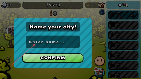 进入这个界面后,要在Entername输入框中填写城市名称,填好之后点击CONFIRM按钮,这样就完成了Nameyourcity的城市命名步骤。