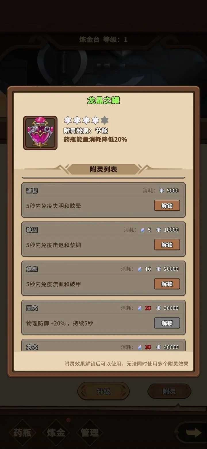 【血瓶的升级与附灵说明】1、血瓶具备升级功能,所需材料为五种钥匙。其中前三种钥匙可通过刷图获取,后两种则需在坊市刷新后购买。坊市刷新需消耗金币,而金币作为游戏通用货币,前期不建议玩家用其刷新坊市。不过坊市每三小时会自动刷新一次,玩家可留意刷新后的坊市是否出现所需钥匙,若有则可用银币购买,以此来完成血瓶的升级。
