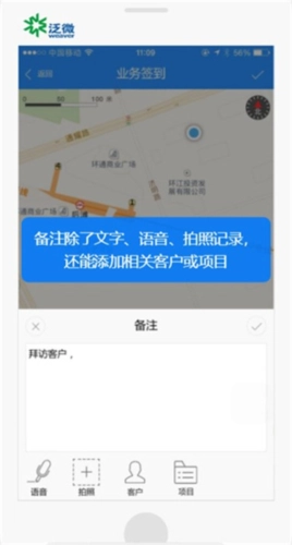 可以通过文字、语音、拍照等方式描述外勤情况,之后点击客户选项。