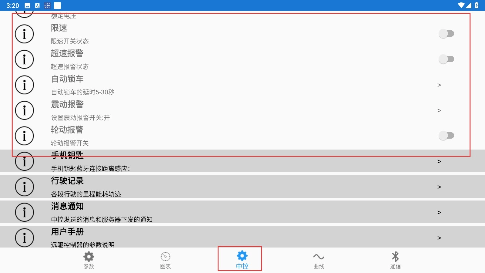 4、进入【中控】页,点击限速、超速报警等功能开关,配置车辆安全参数。