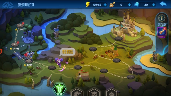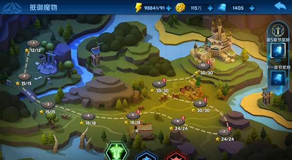 1、游戏拥有30个章节,270多个各种难度的关卡,消耗体力值来挑战,挑战失败不扣除体力,挑战胜利才扣体力,过关后有概率掉落符石,通关每个章节都可领取到章节奖励。关卡满星通关后可以获得宝箱奖励。满星后可进行扫荡,快速获取材料。