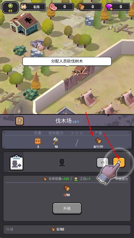 伐木场建成后,进入伐木场界面,可安排人员进行树木砍伐工作,通过点击对应按钮能够调整伐木相关的各项属性,从而帮助提升木材的收集效率。