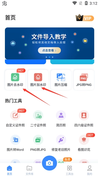 在首页,设有图片去水印、图片加水印、图片压缩、jpg转png、图片转word、图片转pdf等功能。