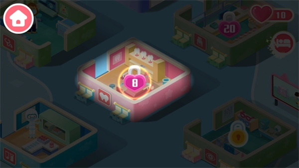 在为病人诊疗的过程中积累好感度,当好感度达到特定数值时,就能解锁诊所的新区域,从而可以为更多不同类型的患者提供治疗服务。