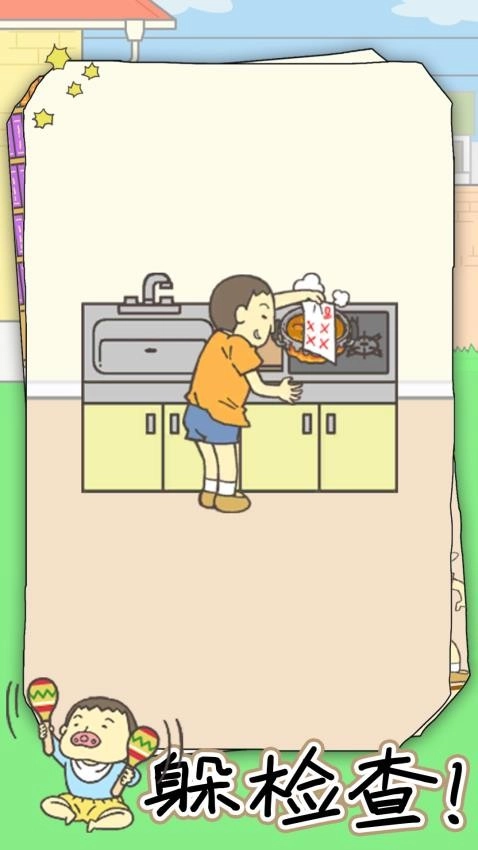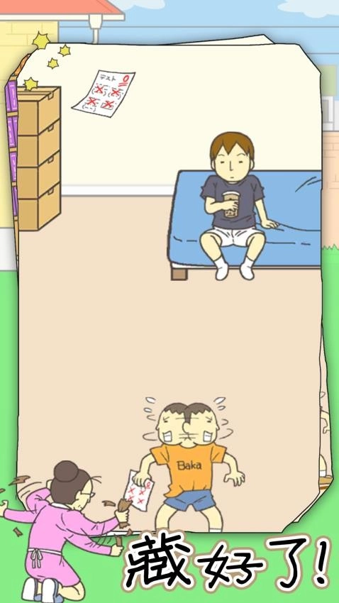 玩家需要在客厅、花园、浴室这类家庭场景里,通过点击的方式收集家具、电器、植物之类的物品,并用这些物品来遮挡试卷或者布置陷阱。要是能成功把试卷藏好,还没被“妈妈”察觉,就算顺利通关了。