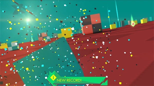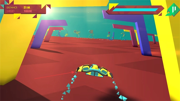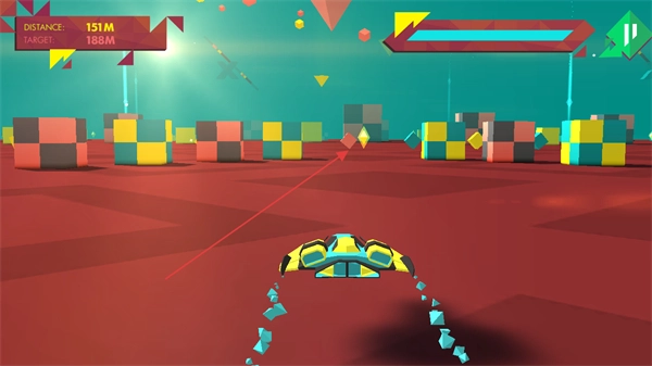 驾驶几何造型的飞船穿梭于色彩斑斓的场景之中,避开紫色方块与彩色方块等各类障碍物,持续拓展飞行距离,比如从51米推进至151米。