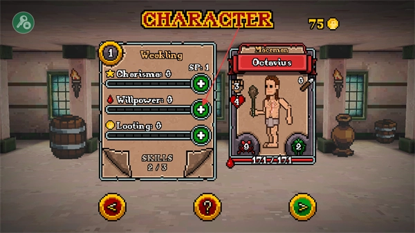 1、进入竞技场后,优先选择角斗士职业属性,可以花费金币重新获取一个角色,选择结束后点击下方绿色按钮进入下一步。