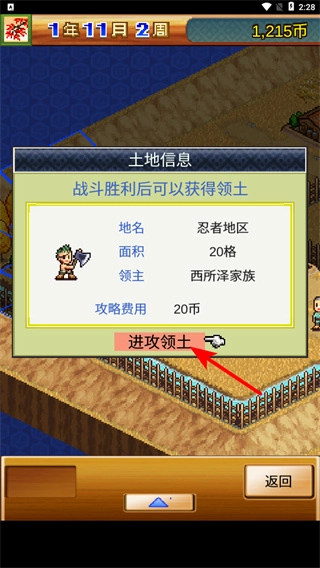 1、在土地信息界面,点击进攻领土按钮,可花费20币对忍者地区发起进攻,战斗胜利后能获得该领土,拓展忍者村领地范围。