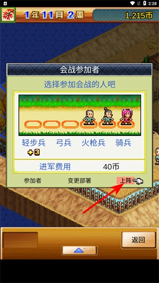 2、于会战参加者界面,选中轻步兵、弓兵等兵种,接着点击上阵按钮,支付40币便能参与会战,兵种的合理搭配乃是取得会战胜利的关键所在。